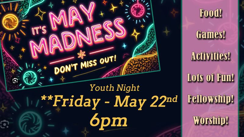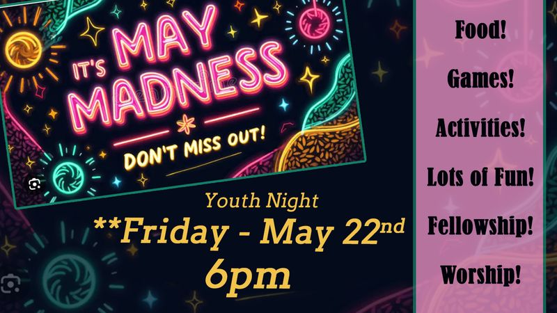 We invite you to come out and enjoy our MAY MADNESS YOUTH NIGHT on May 22nd at 6:00 p.m.